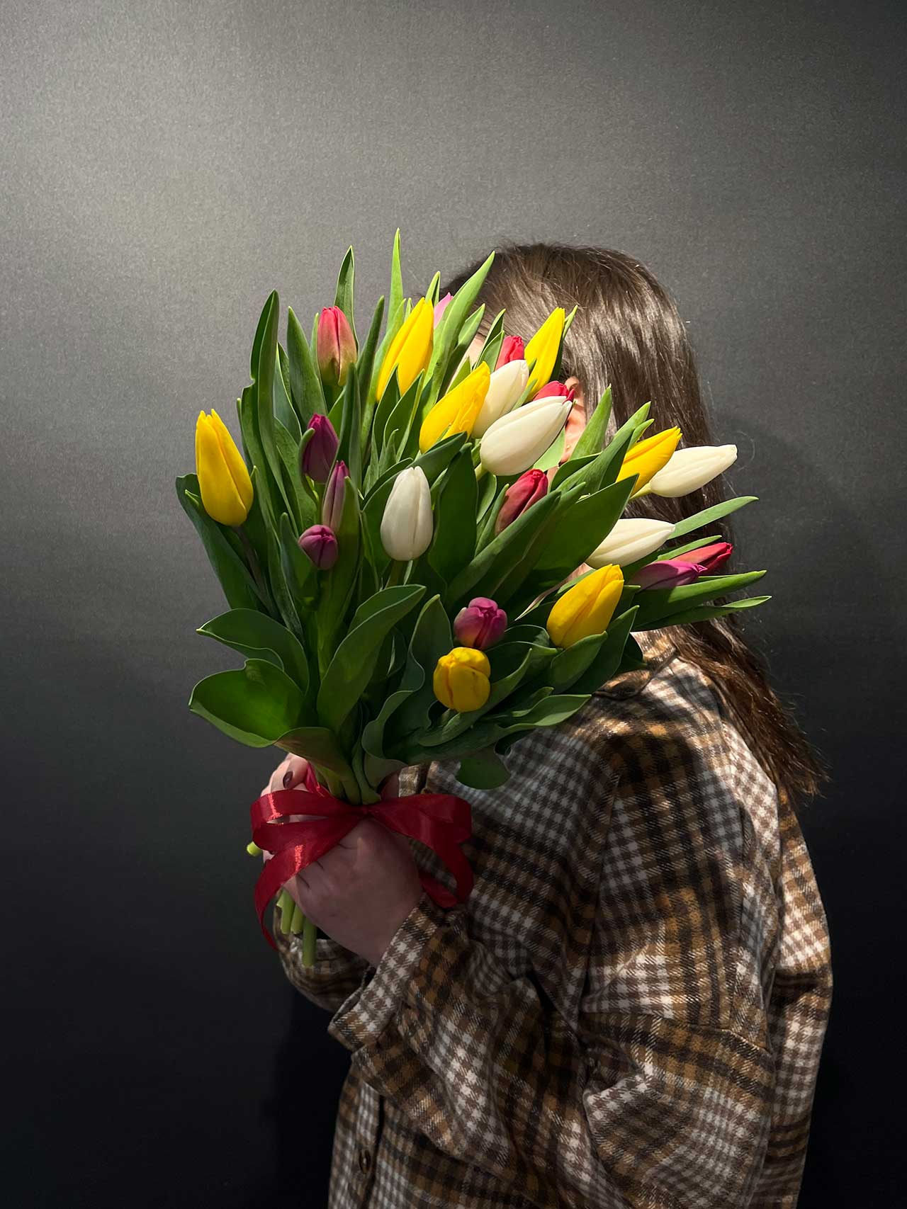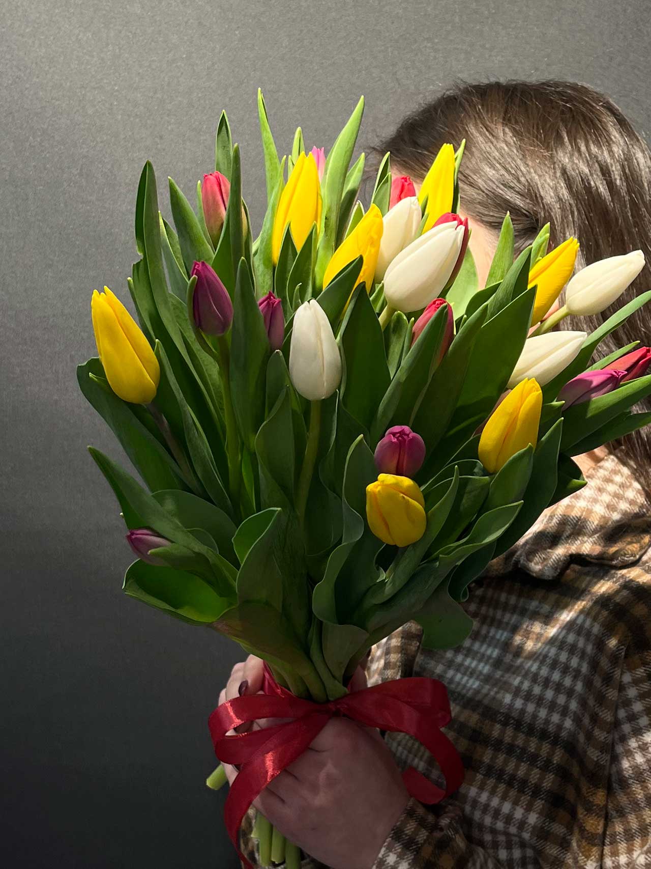 25 тюльпанов под ленту — нежный комплимент, который невозможно не почувствовать