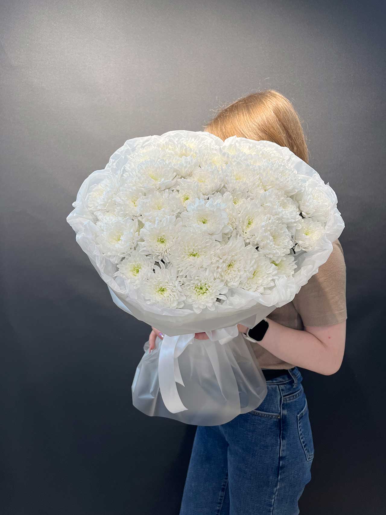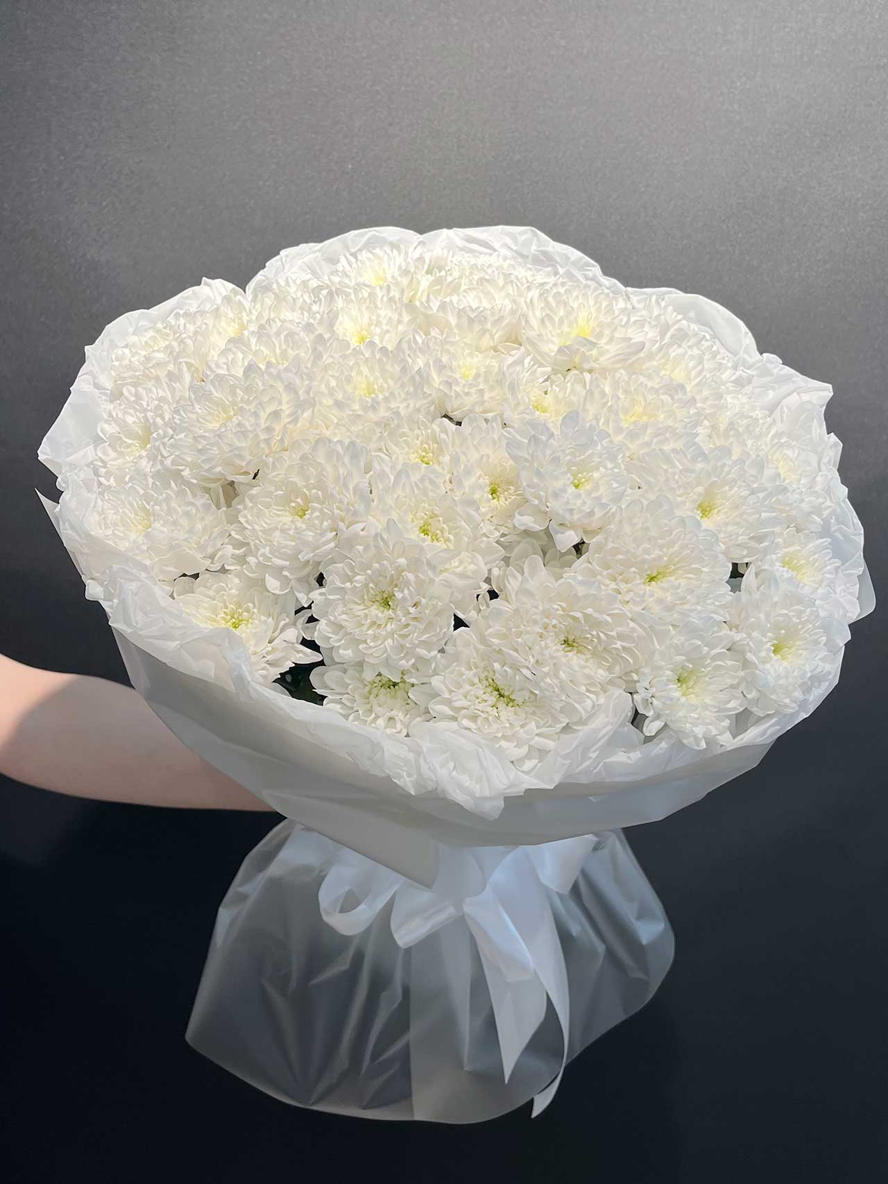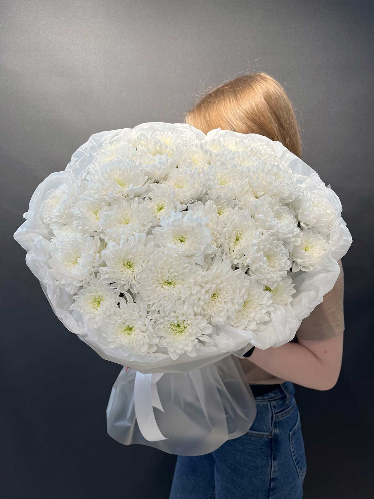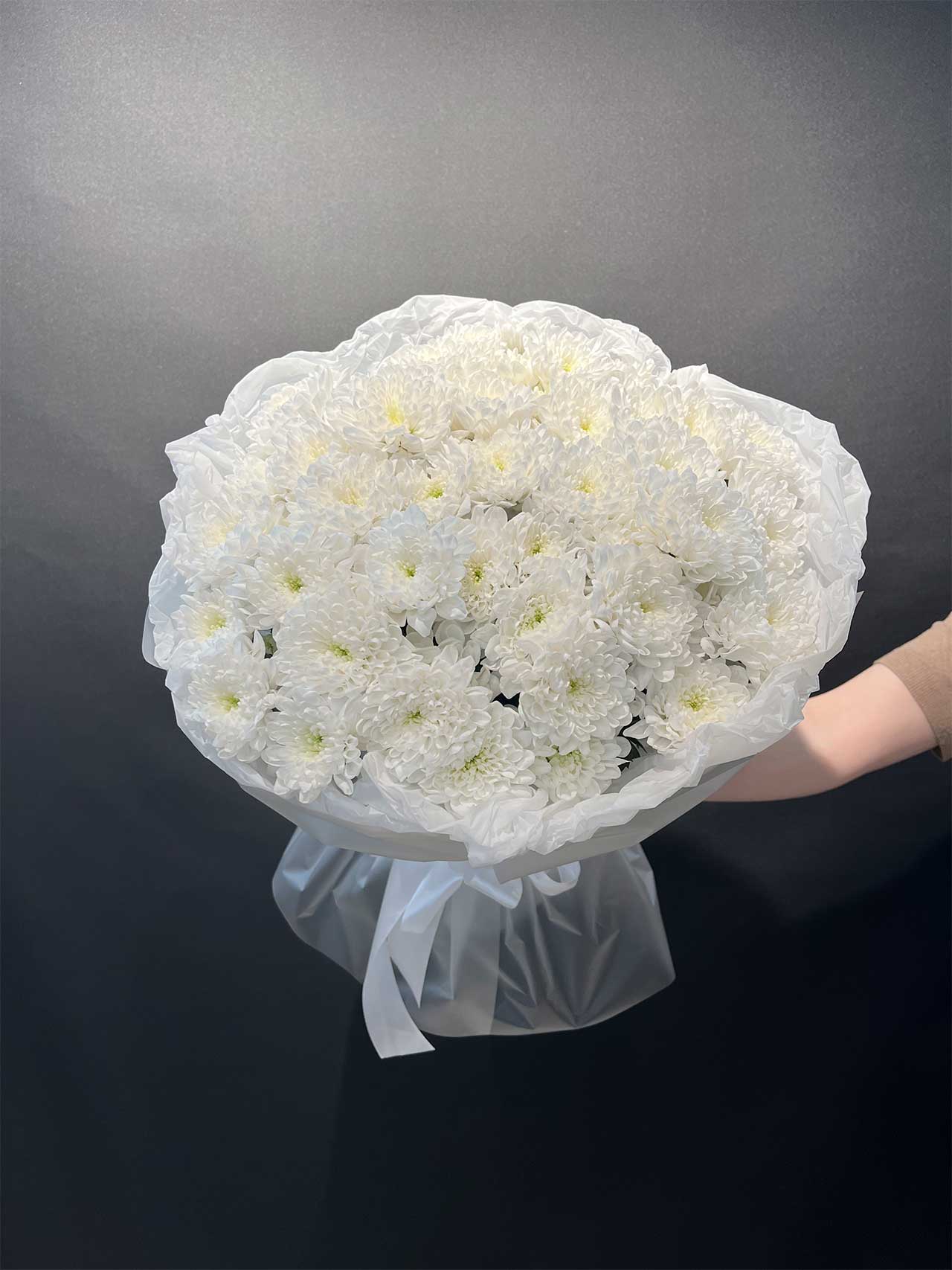 Этот букет словно танцует вальс из белоснежных лепестков, создавая атмосферу нежности и изыска. Каждая хризантема символизирует чистоту и гармонию, превращая ваш подарок в настоящий шедевр природы.