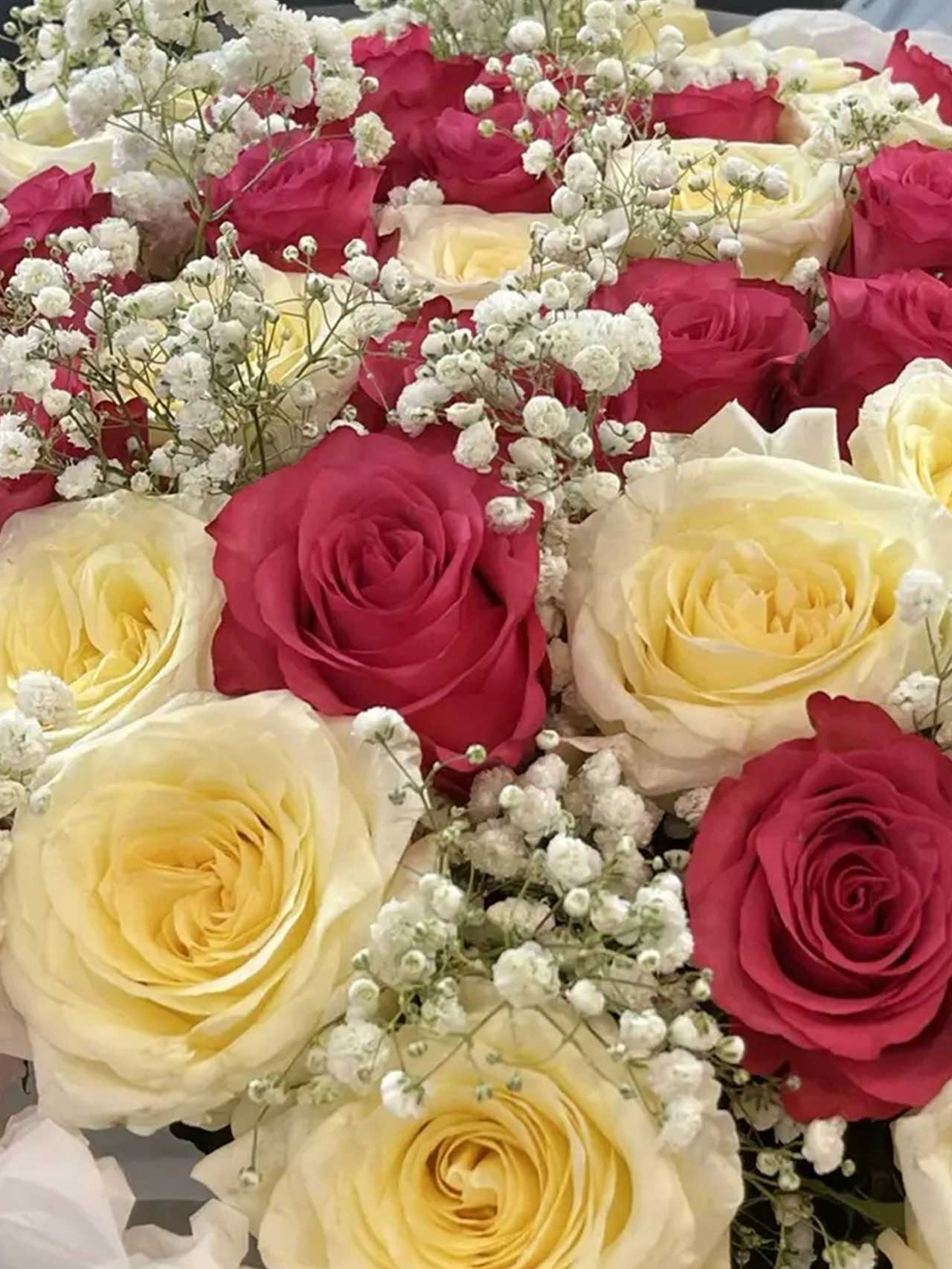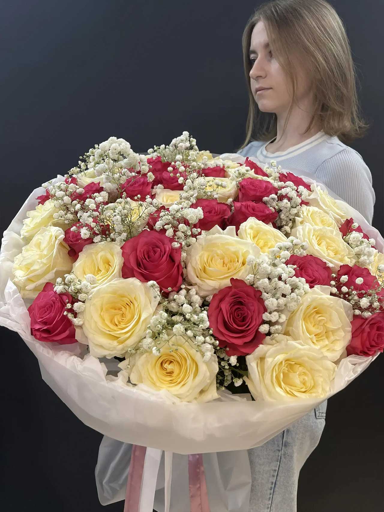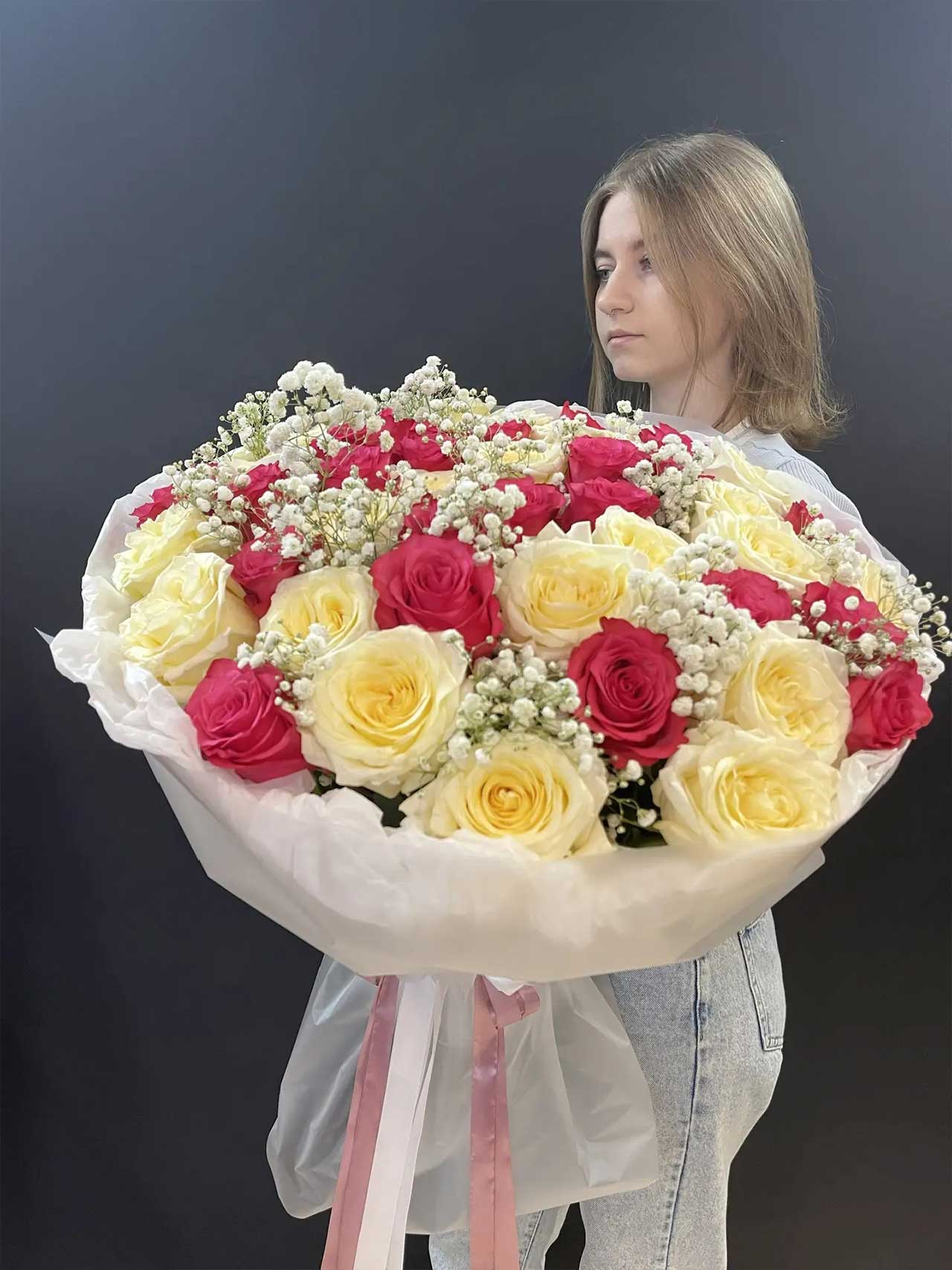 - Облако гипсофилы: Мелкие соцветия белой гипсофилы добавляют композиции легкости, превращая строгий букет роз в нежное цветочное облако.