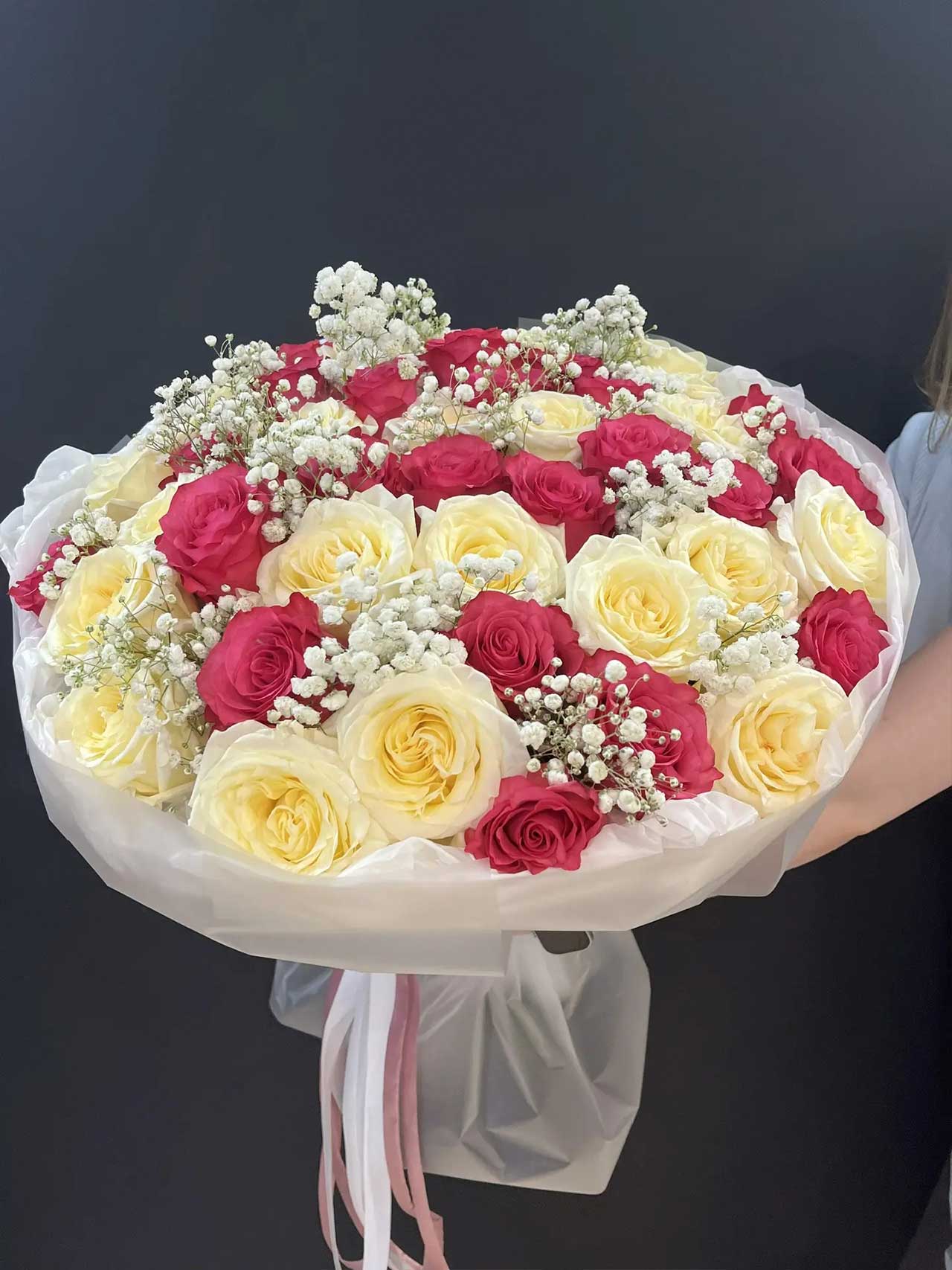 - Премиальная упаковка: Сочетание невесомой бумаги тишью и матовой матовой пленки придает букету современный вид и защищает хрупкие лепестки.
