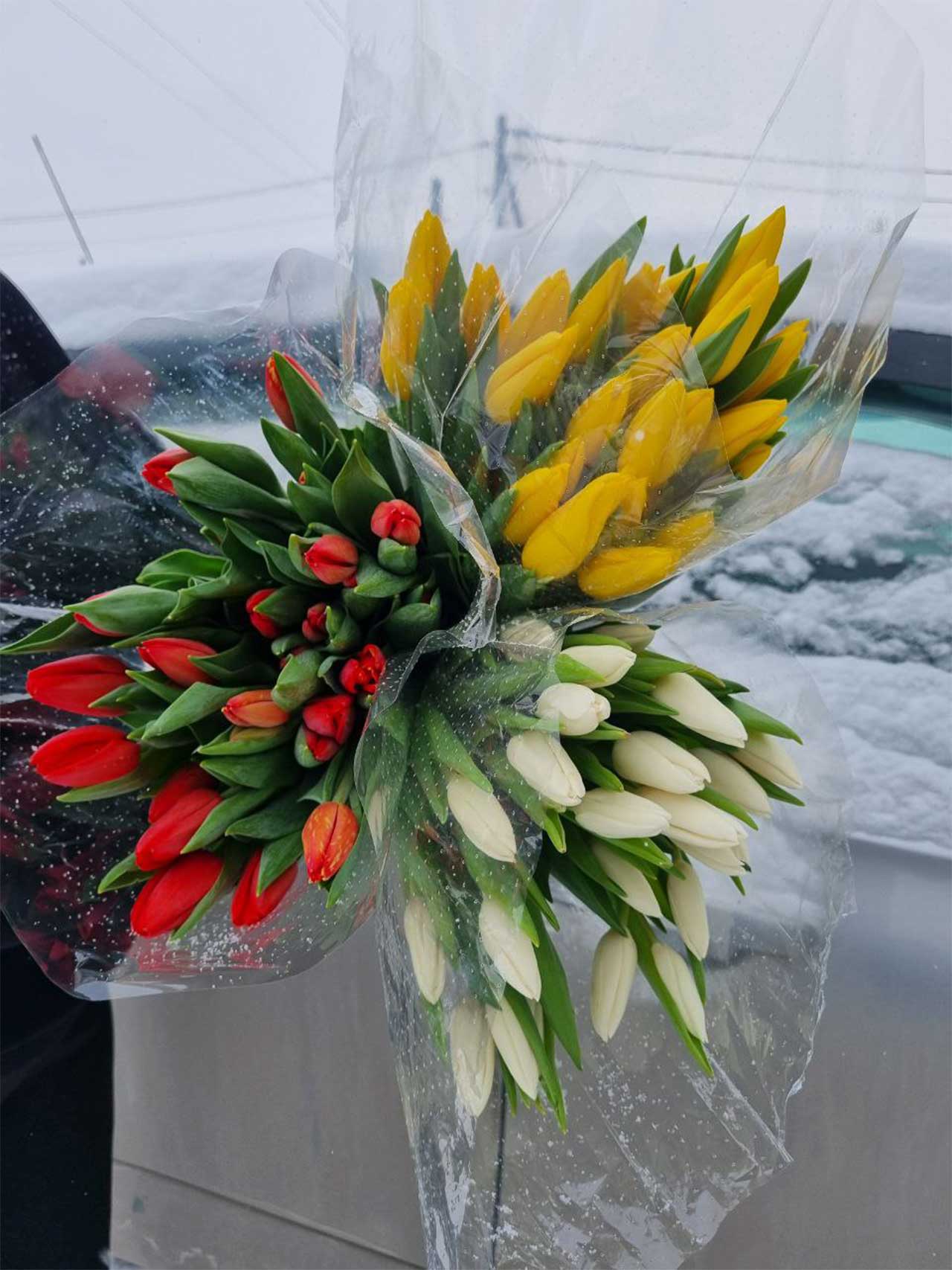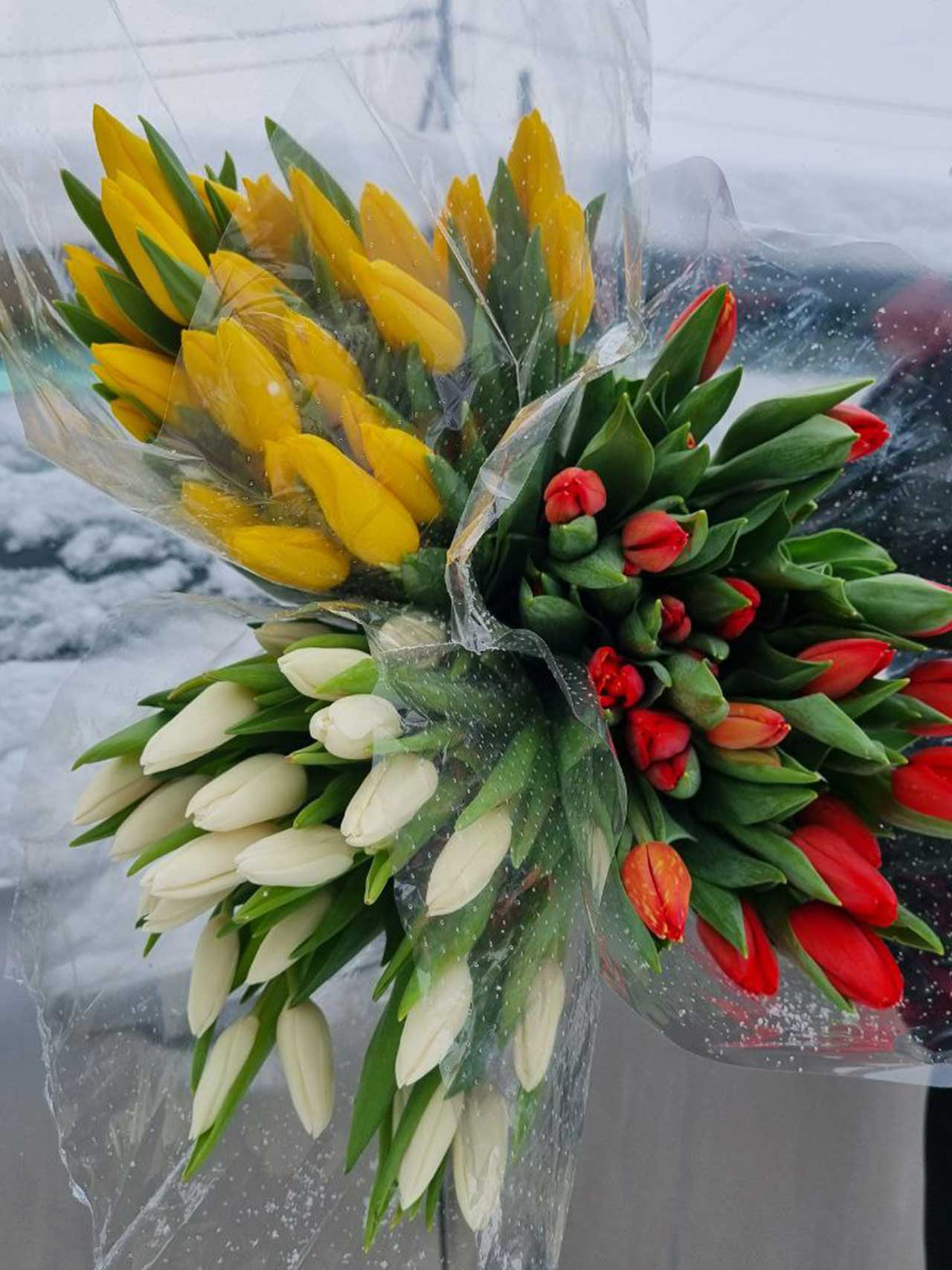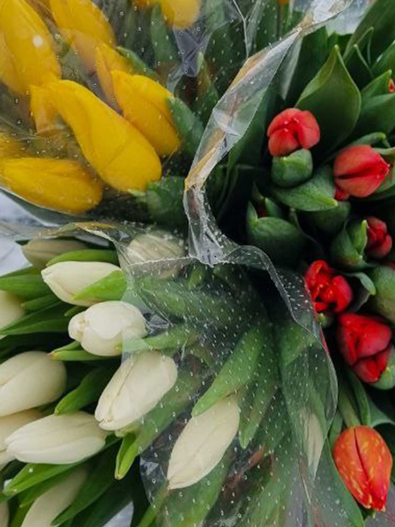 Тюльпаны МИКС — 25 шт. в транспортировочной упаковке: удобно везти, легко хранить, идеально для подарка и оформления.