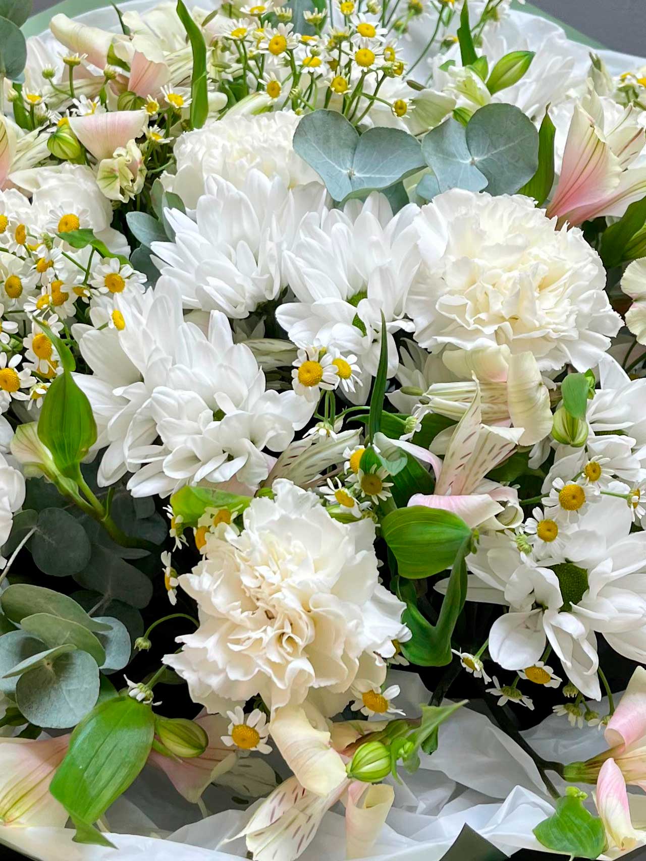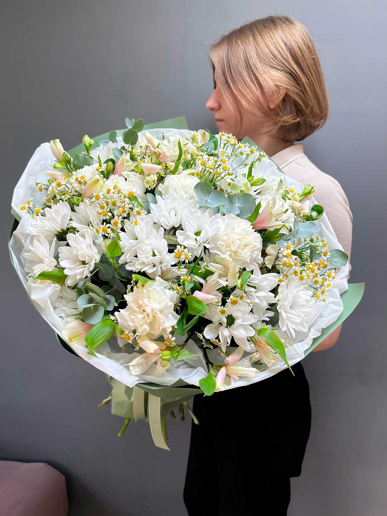 Хризантемы, символизирующие счастье и оптимизм, напоминают о теплых летних днях, когда природа расцветает. Альстрамерия, с её нежными лепестками, олицетворяет преданность и искренние чувства, а танацетум добавляет яркие акценты, символизируя радость и веселье. Диантусы, известные своей утонченной красотой, придают букету романтическое настроение, а эвкалипт дарит свежесть и легкость.