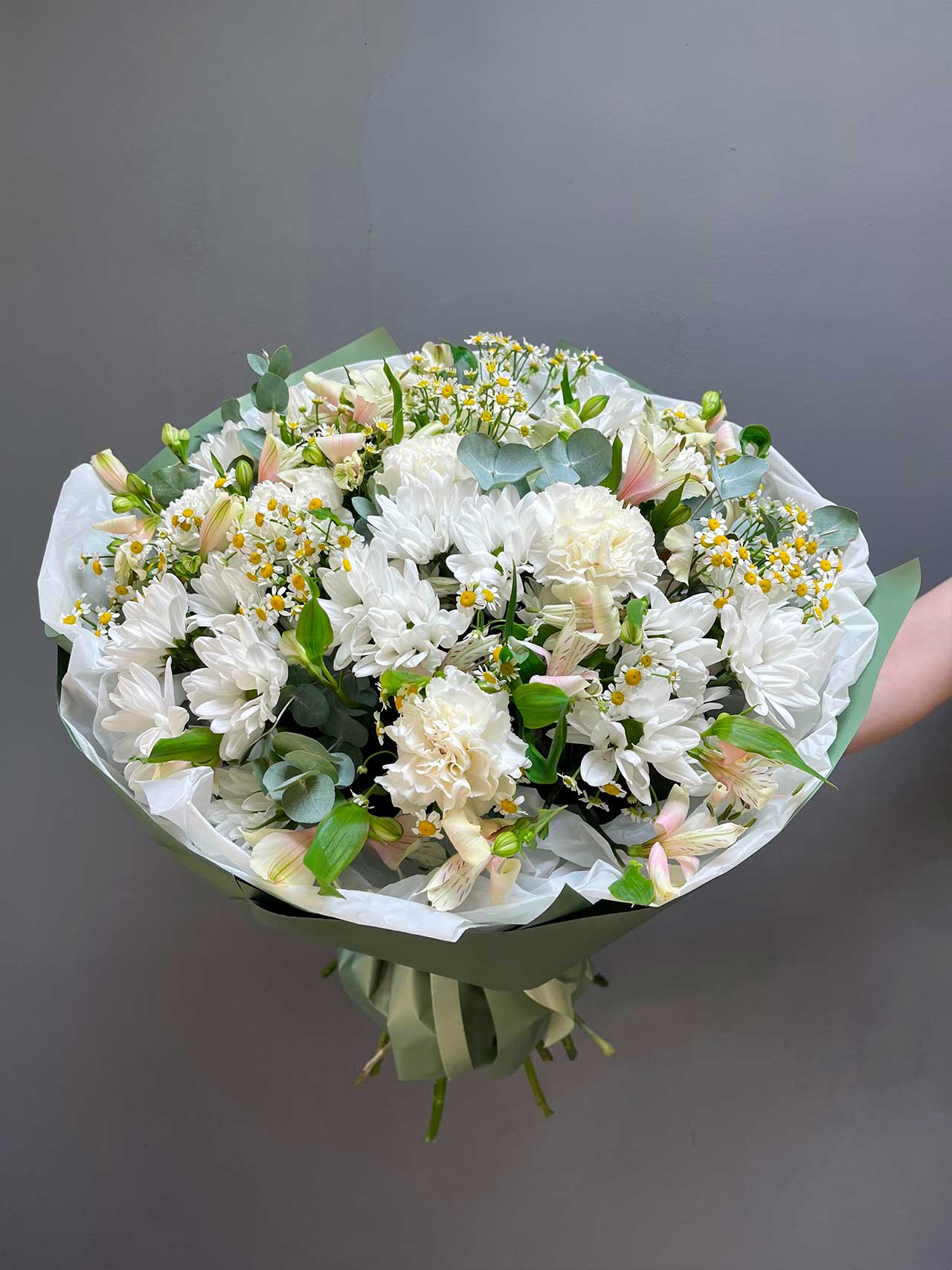 Погрузитесь в атмосферу солнечного лета с букетом «Летний Променад». Этот яркий и жизнерадостный букет состоит из пяти кустовых хризантем, восьми альстрамерий, пяти танацетов, пяти диантусов и свежего эвкалипта. Каждый цветок в этой композиции — это не просто элемент, а часть истории о любви, дружбе и радости.
