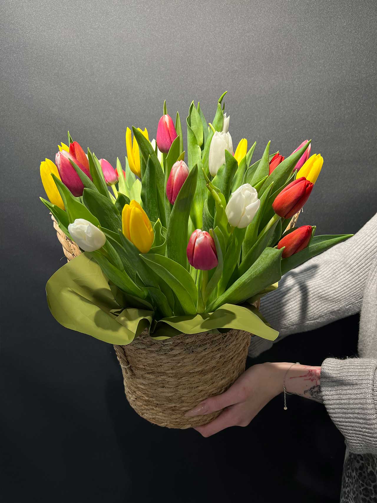 25 тюльпанов в корзине — нежный подарок со вкусом
