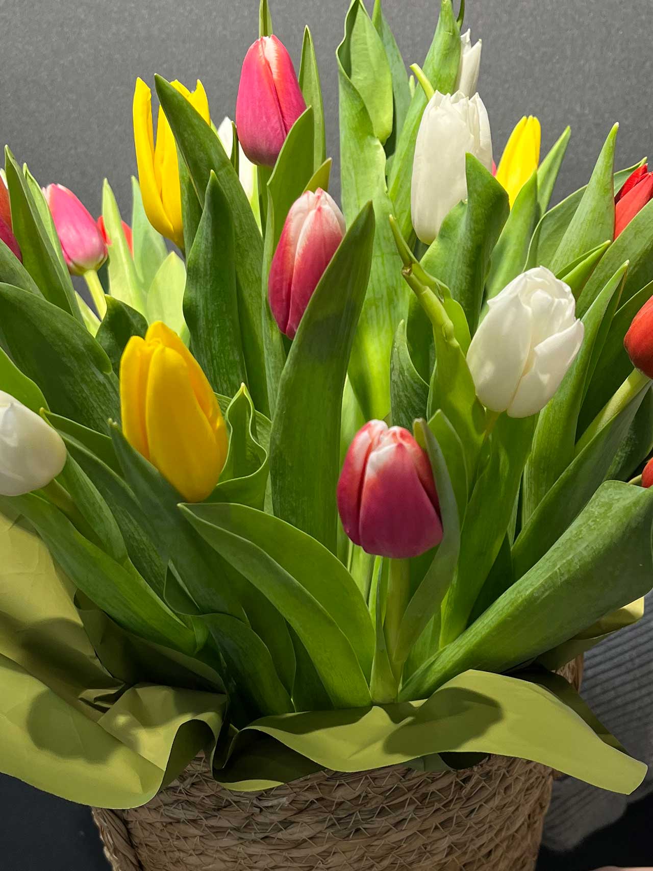 25 тюльпанов в корзине легко дарить и приятно получать: удобно для доставки, эффектно для фото и идеально для уютного дома. Выбирайте свежие тюльпаны — и дарите эмоции, которые остаются надолго.